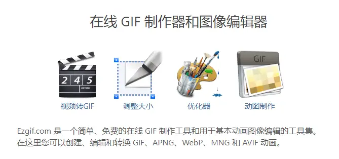 Ezgif在线gif图片制作神器管理员1年前更新6090 Ezgif是一个免费的在线GIF制作工具,在这里您可以创建、编辑和转换GIF、SVG、APNG、WebP、MNG和AVIF动图,以及调整大小、旋转、裁剪、优化、添加文字、转换格式等操作。 官网https://ezgif.com/ THE END软件分享 喜欢就支持一下吧点赞0 分享QQ空间微博QQ好友海报分享复制链接