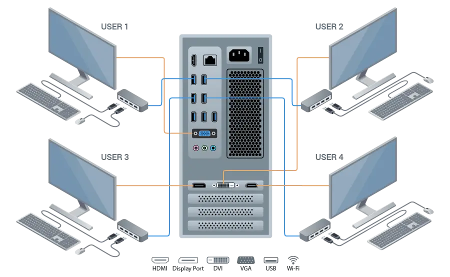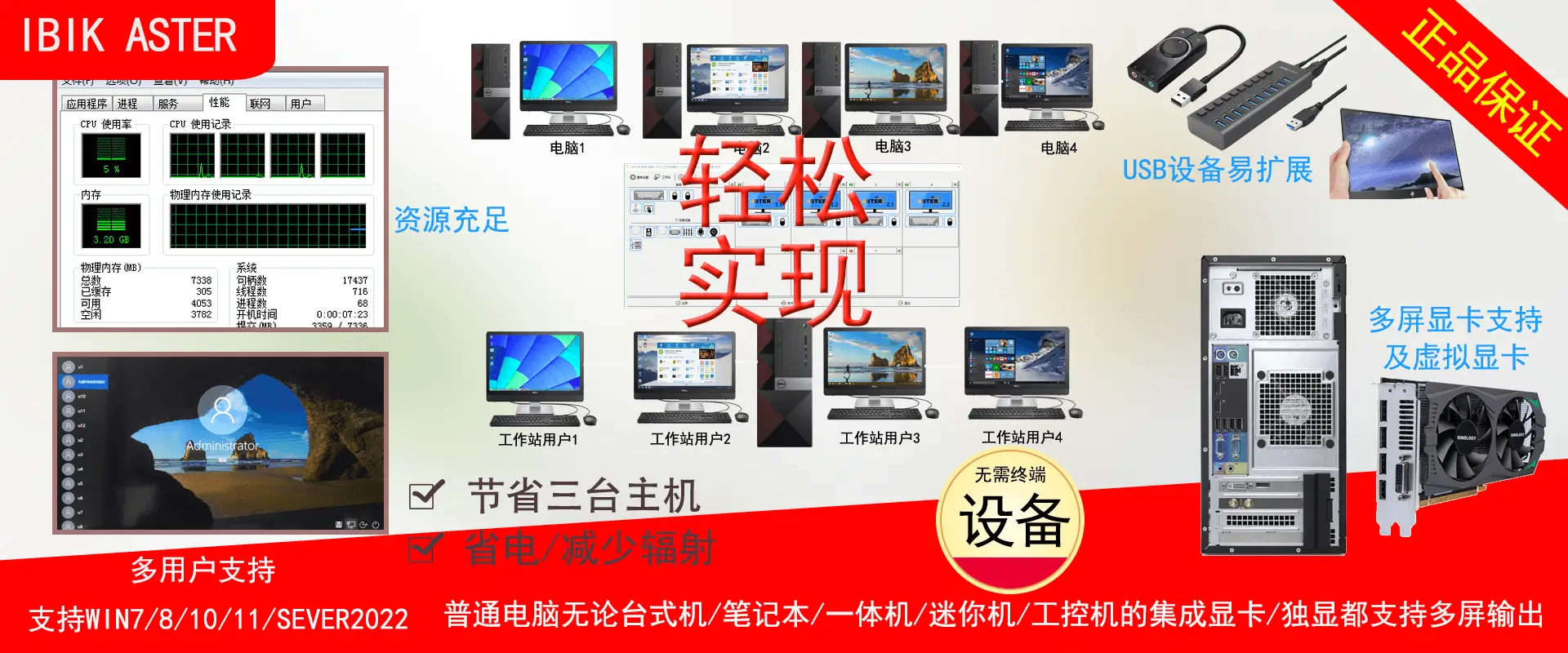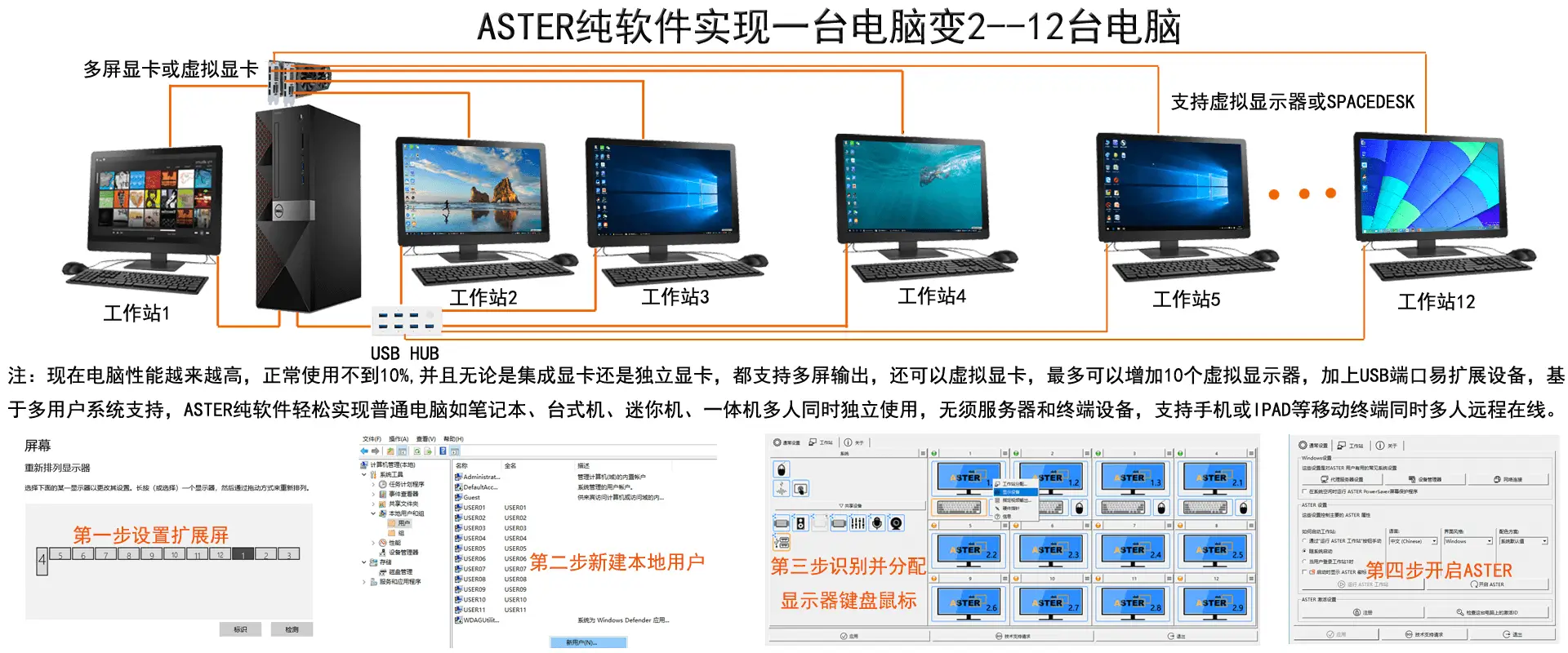 ASTER纯软件实现一台电脑变成2~12台电脑,只要准备多套显示器键盘鼠标就能一台电脑多人同时独立使用,完全区别于云终端和虚拟机,无需服务器终端设备,普通电脑纯软件就能轻松实现一台电脑变多台,大大减少采购电脑主机费用和后期用电,简单高效稳定。