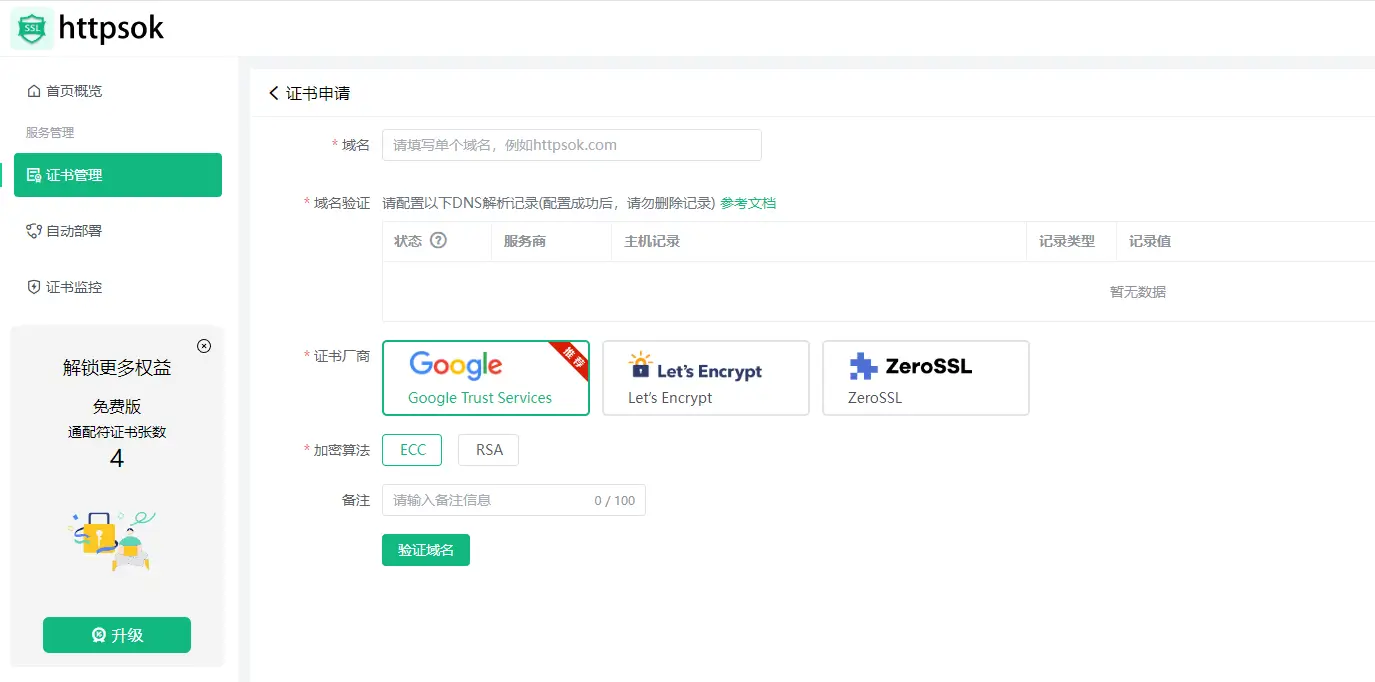 证书的品牌有Google Trust Services、Let’s Encrypt、ZeroSSL,支持CDN/OSS,支持一键部署,脚本支持证书自动申请、替换、重载,无须人工介入,一行命令,轻松搞定SSL证书自动续期。