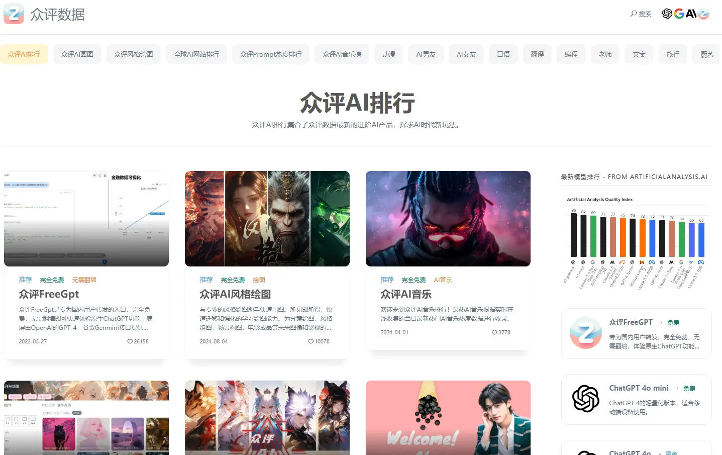 众评数据这个网站整合了全球ai热门工具,并且对热门ai工具分类排行展示,但是他最强的地方应该是ai人物对话,随时随地与拥有海量数据支持的专业人物进行1v1在线聊天,另外他的网站排版和封面图都设计的非常有意思。