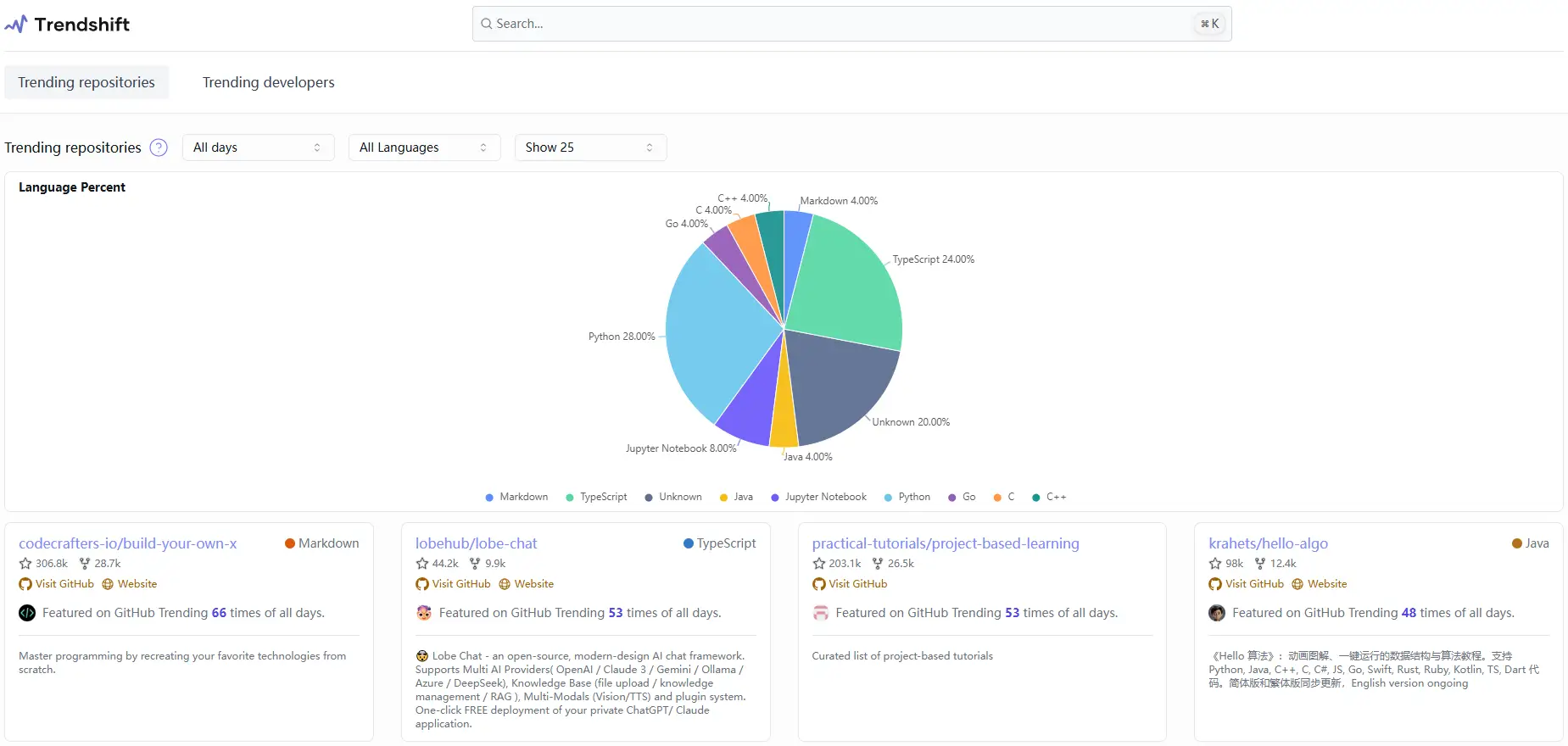 Trendshift.io 是一个网站,专注于展示GitHub上的编程语言和工具分类热门开源项目,该网站会根据时间分数排名,提供流行的项目列表,帮助开发者发现人工智能、网页开发、系统设计等领域的最新趋势和资源。