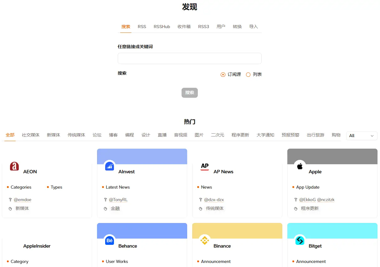 RSSHub开源RSS订阅源生成工具https://docs.rsshub.app/zh/
