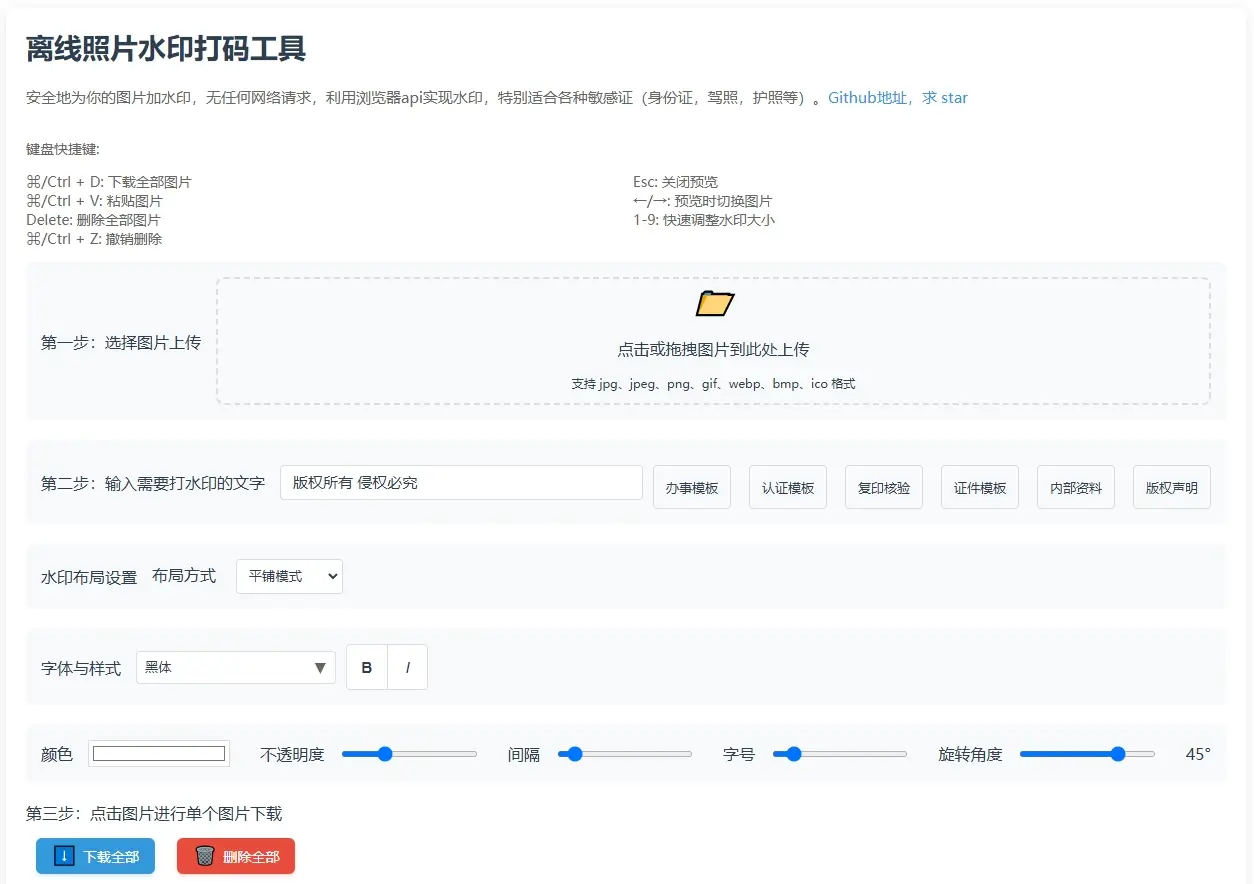 photo-watermark是一个纯前端实现的离线水印工具,无需上传图片到服务器,无任何网络请求,利用浏览器api实现水印,纯浏览器端处理,无需后端服务,特别适合处理敏感证件,保护隐私安全。