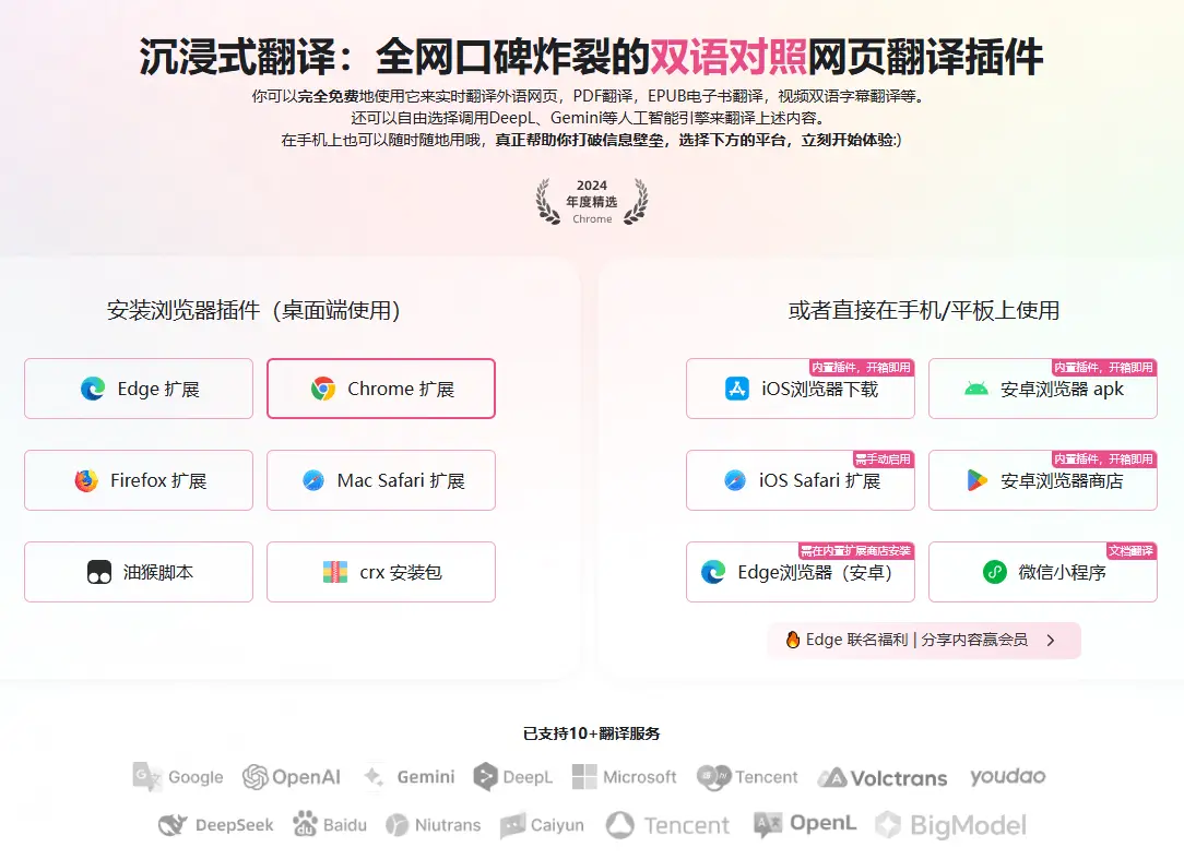 沉浸式翻译是一款支持双语对照的网页翻译插件,你可以使用它来实时翻译外语网页,网页翻译,图片翻译,视频字幕翻译,PDF翻译,EPUB电子书翻译,视频双语字幕翻译等,还可以自由选择调用OpenAI、Gemini等人工智能引擎来翻译上述内容,内置10多种翻译引擎,同时支持安卓,ios客户端,真正帮助你打破信息壁垒。