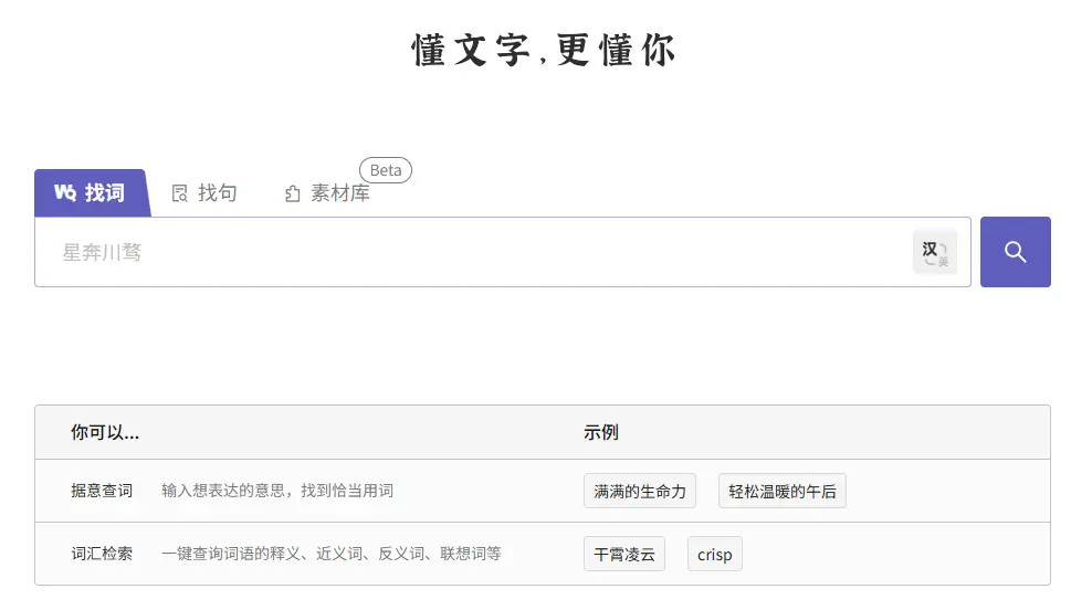 深言达意是一款智能辅助写作工具,核心功能是根据网词、老梗、文字意境、现代化诗词查词,同时也可以根据模糊的描述,找到贴切的词语和名言佳句,支持汉英双语,使诗词更加展现文字艺术意境。